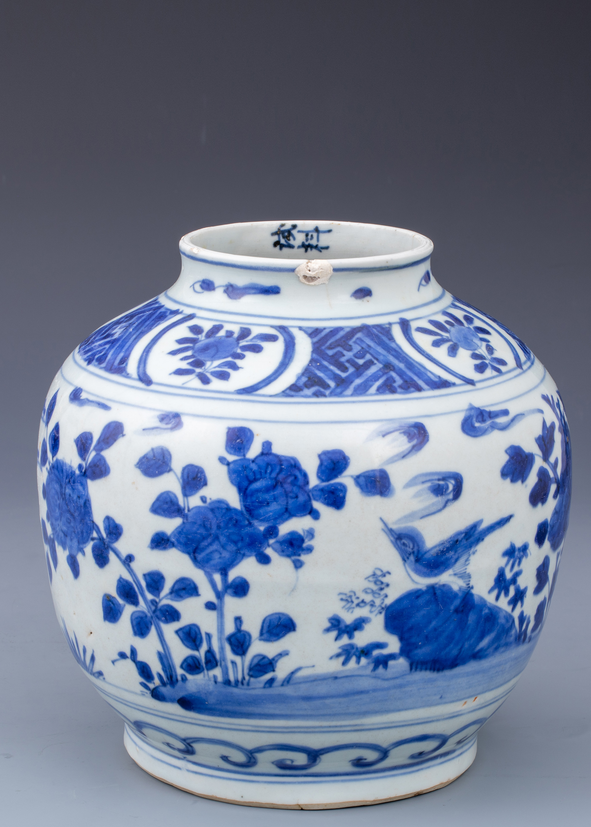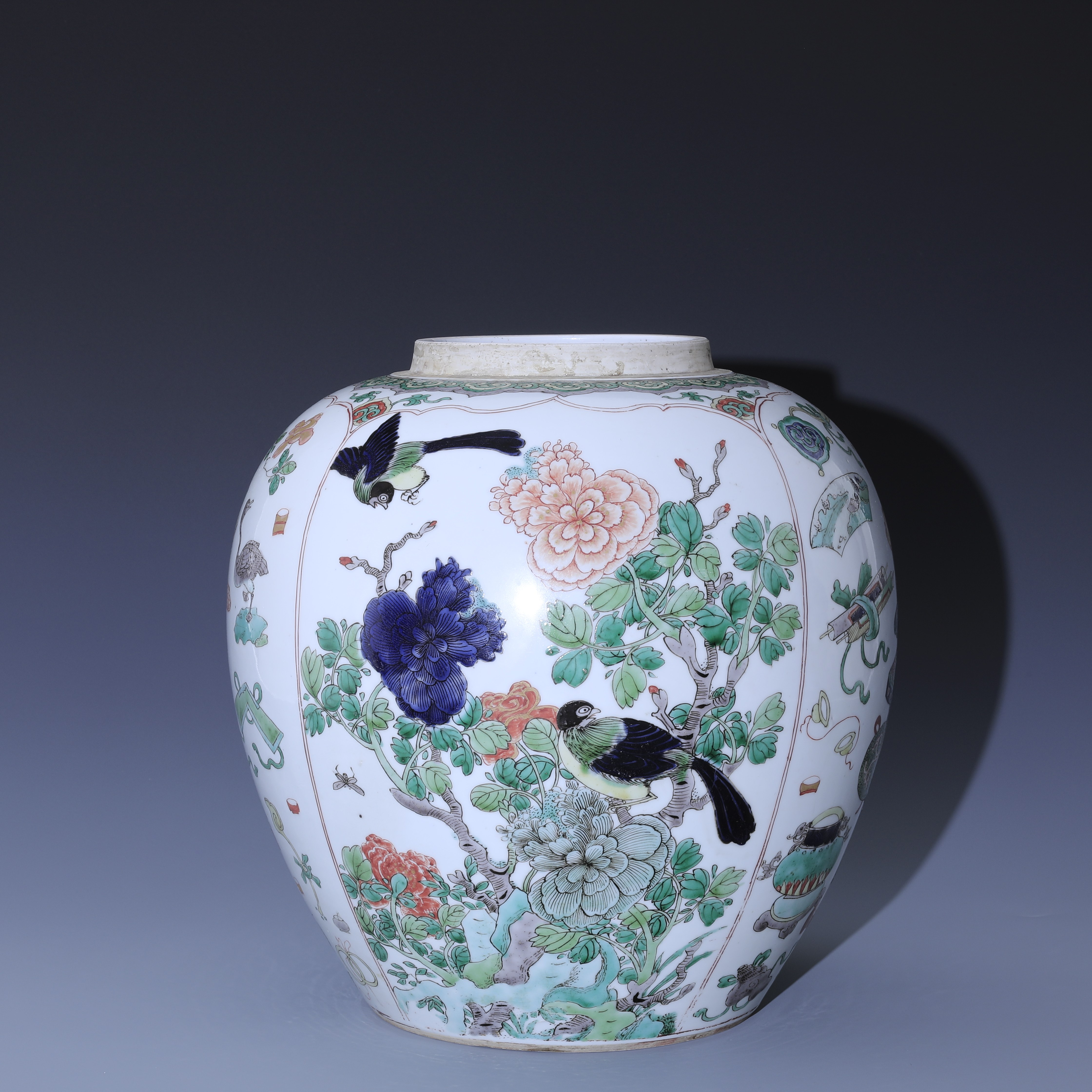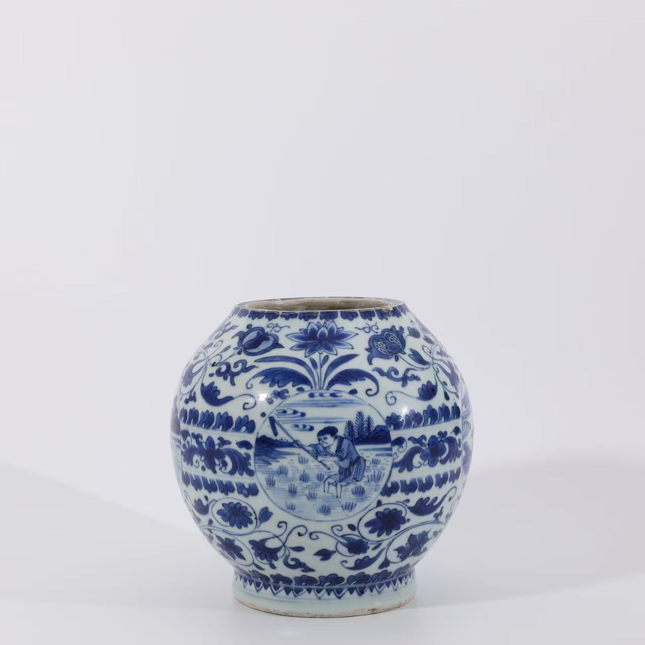 清康熙青花蛱蝶开窗福禄寿纹罐